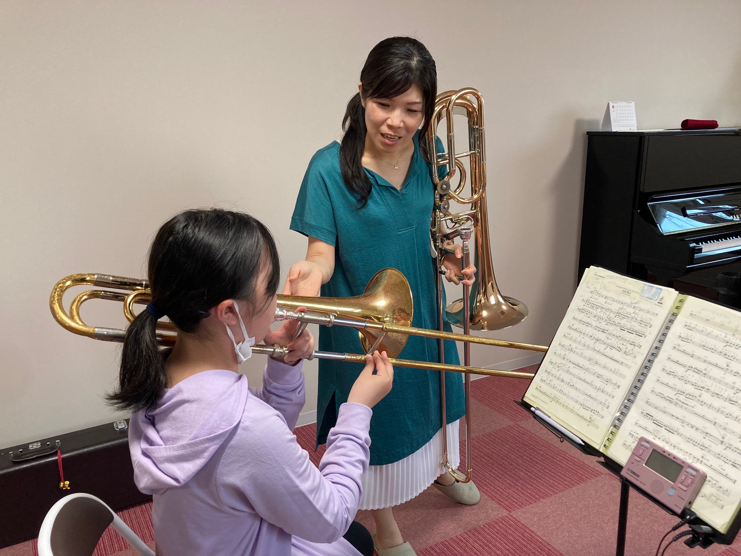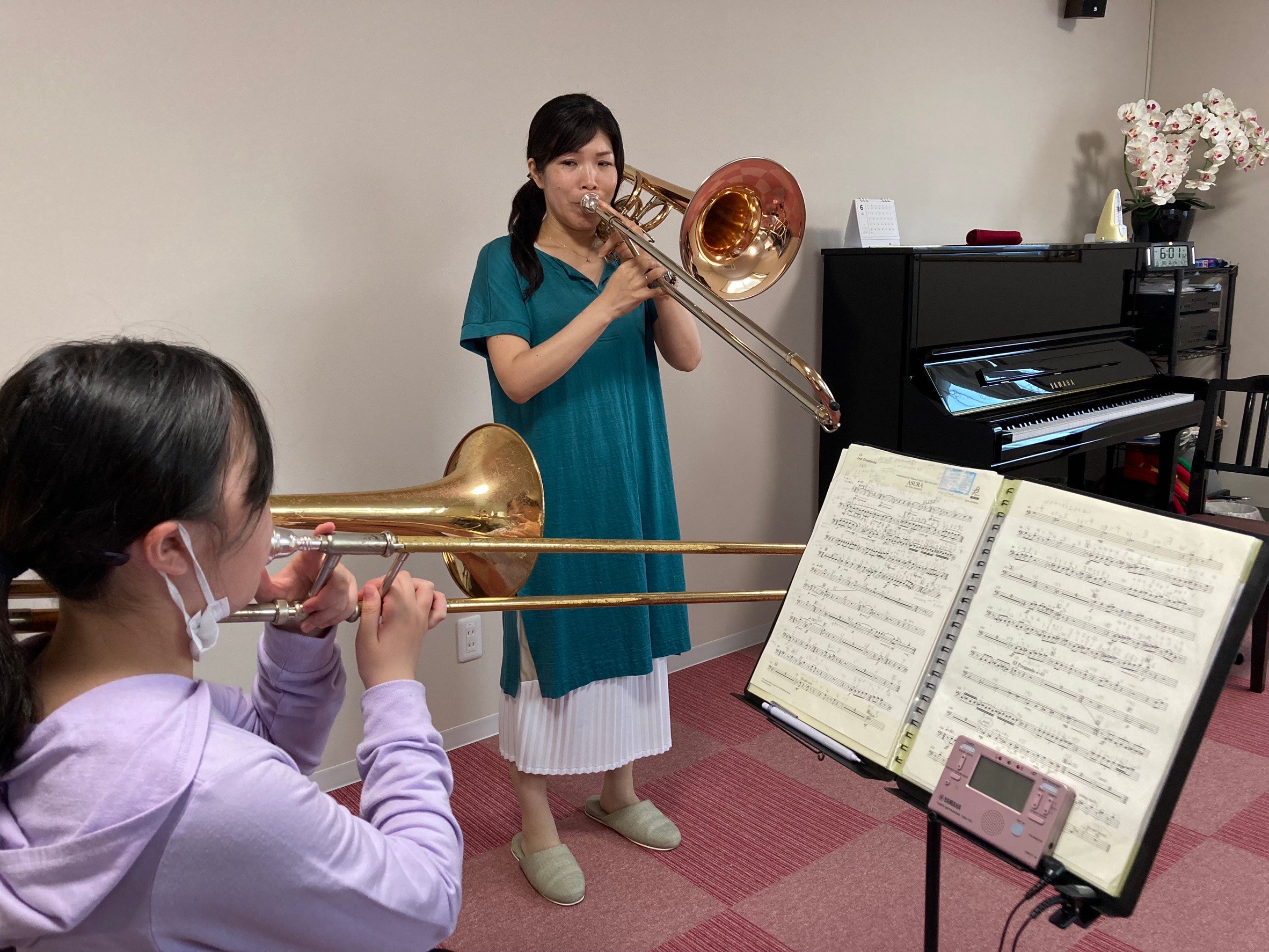 スライドを動かすことで無段階に音の高さを変えることができるので、豊かで荘厳な音色から、象の鳴き声のような音まで、幅広く表現できる楽器です。