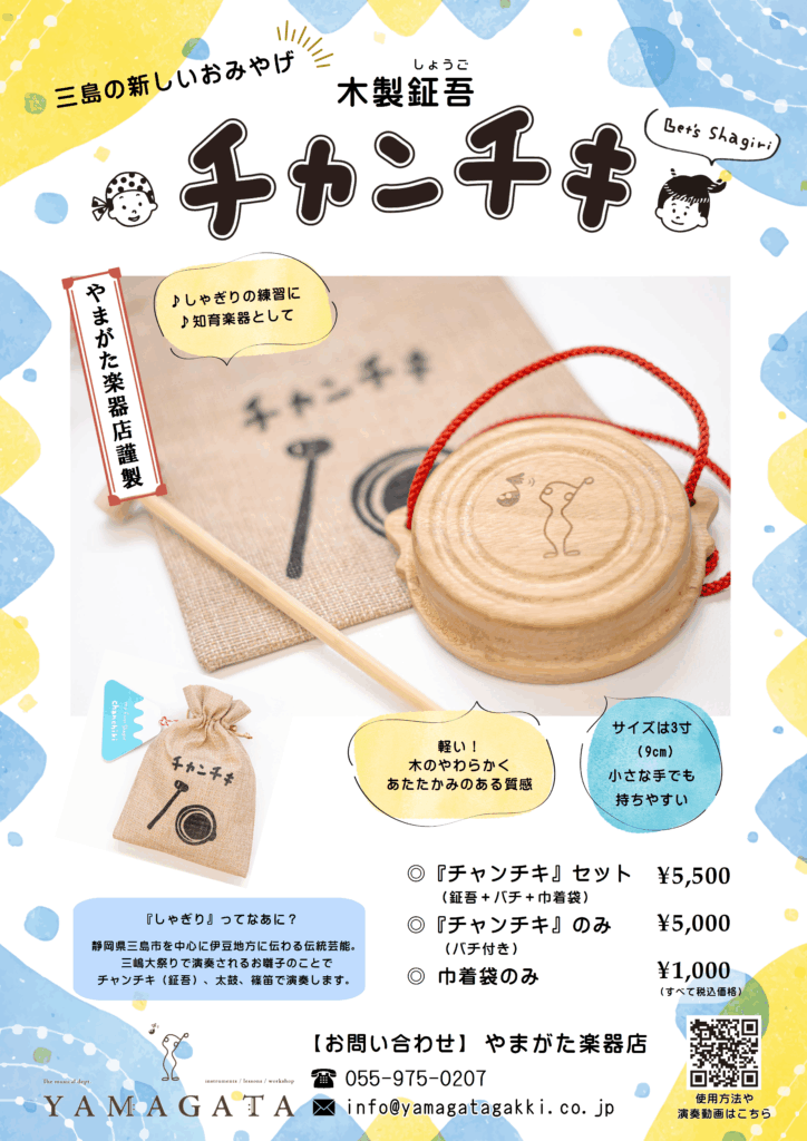 しゃぎりのまち、三島の「やまがた楽器店が」商品開発した、木製の鉦吾(カネ)です。